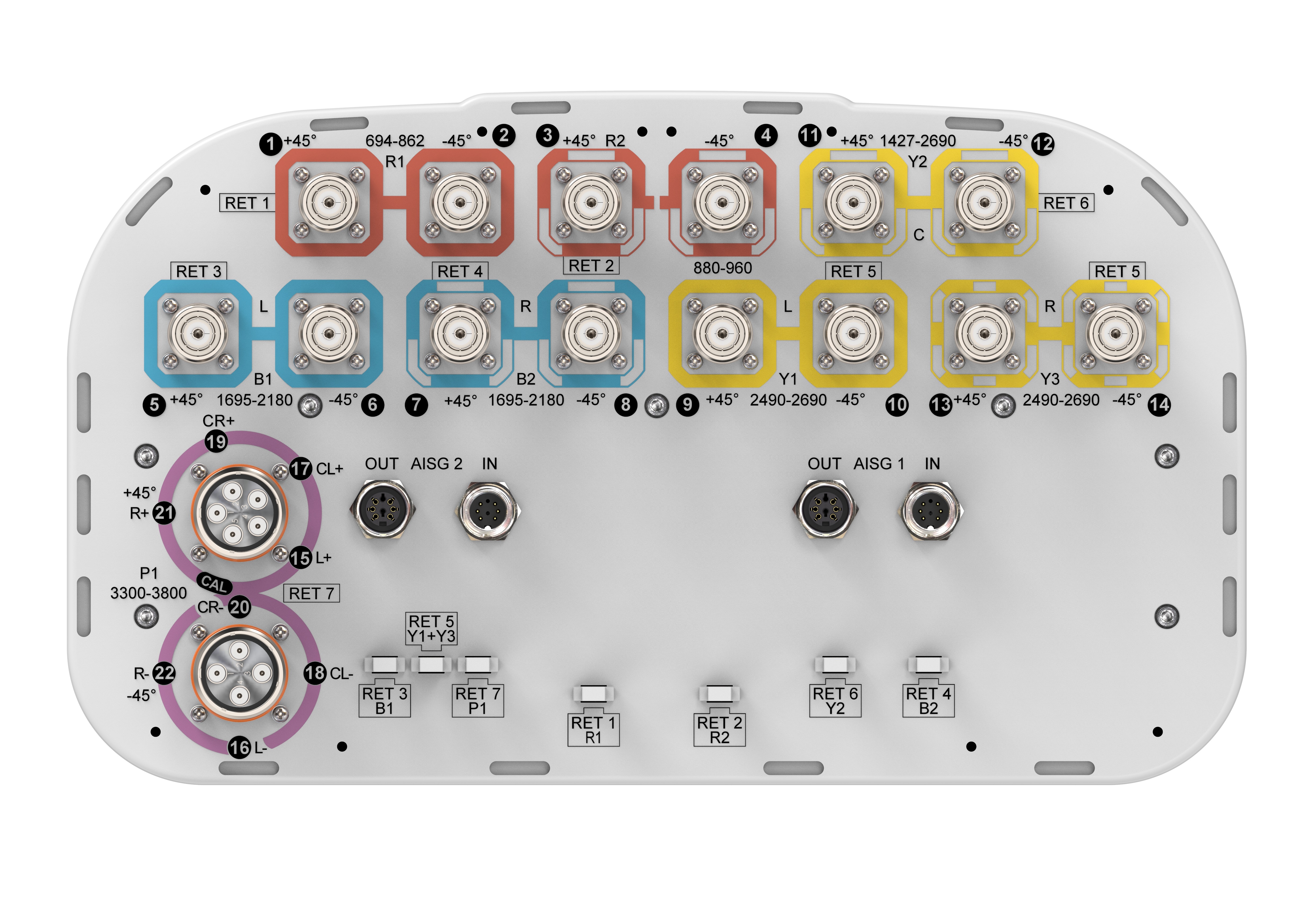 22-port sector antenna, 2x 694-862 (R1), 2x 880-960 (R2), 2x 1427-2690 (Y2), 4x 1695-2180 (B1-B2), 4x 2490-2690 (Y1 & Y3) MHz, 65° 8x 3300-3800 (P1) HPBW, 7X RET. Y1 & Y3 share common RET.