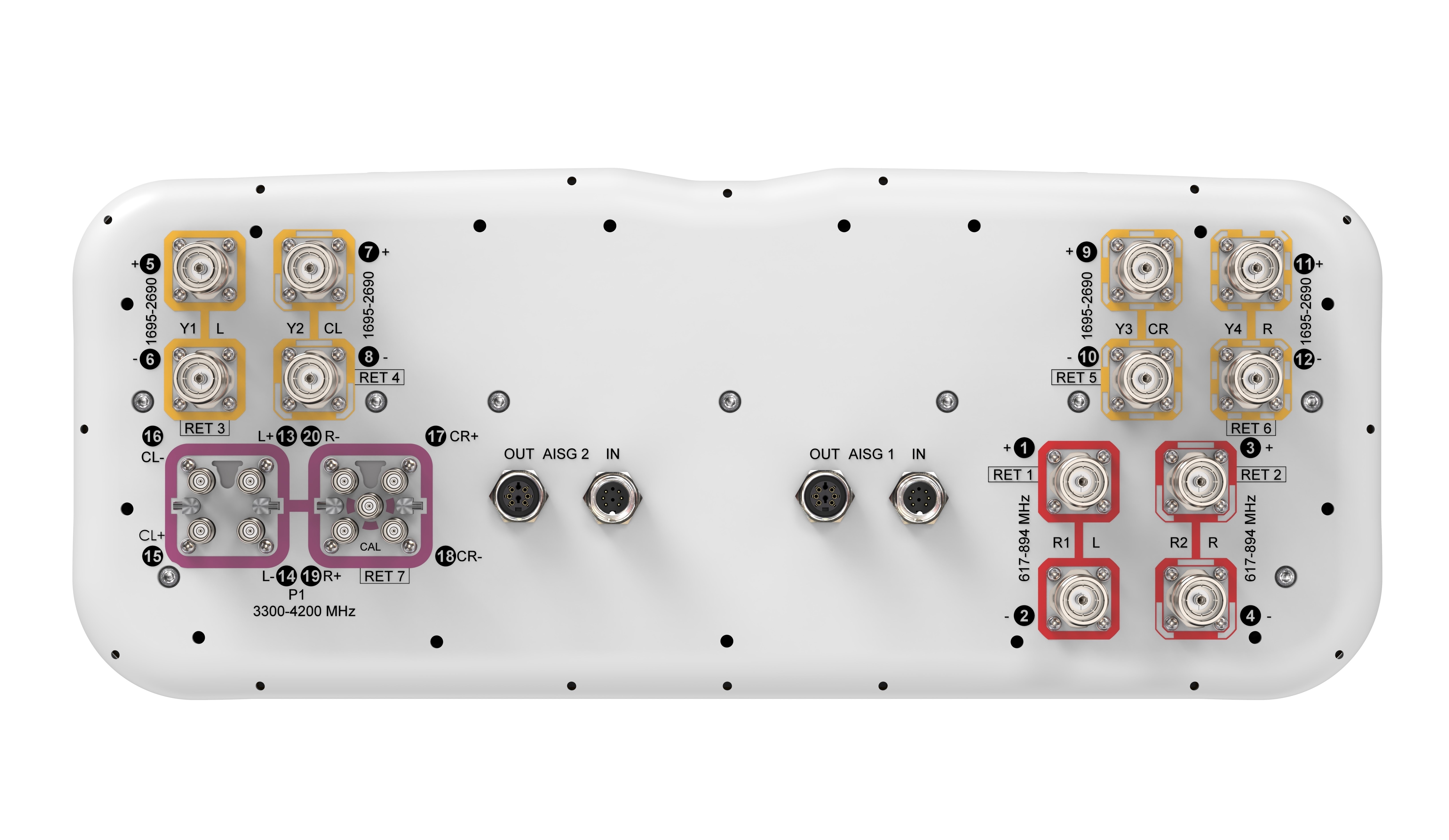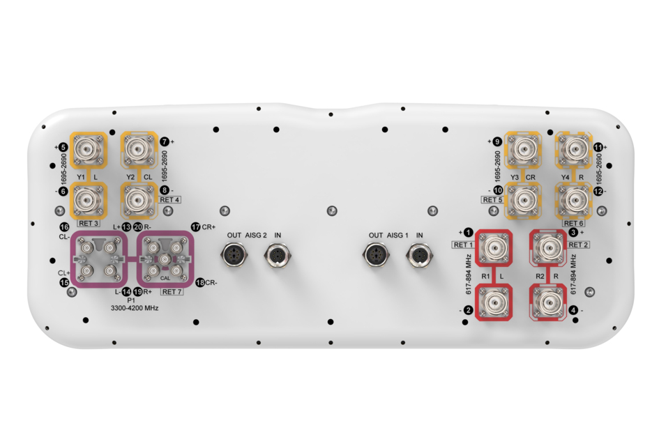20-port sector antenna, 4x 617-894, 8x 1695-2690 MHz, 65° HPBW and 8x 3300-4200 MHz, 90° HPBW, 7x RET.