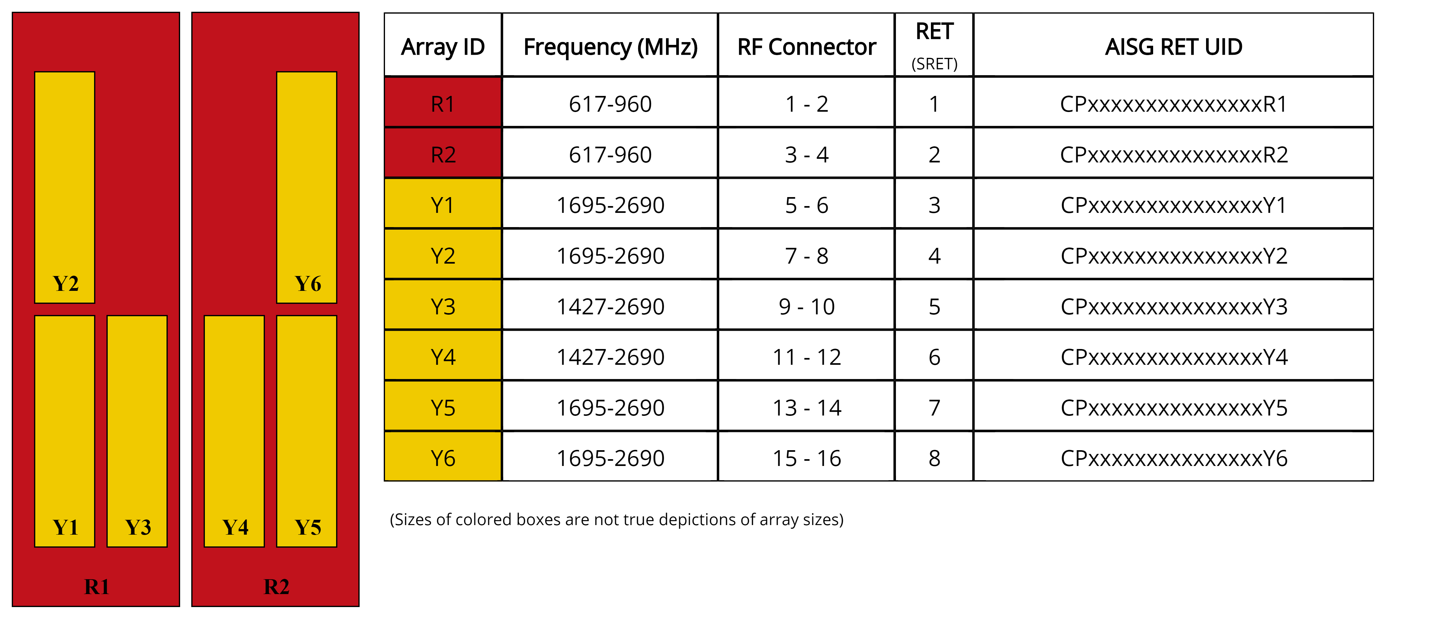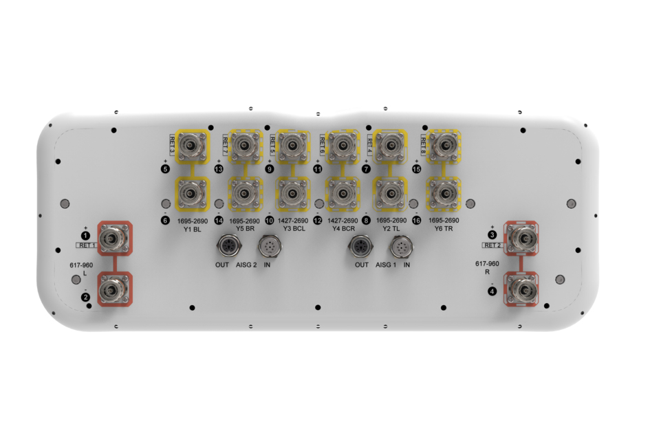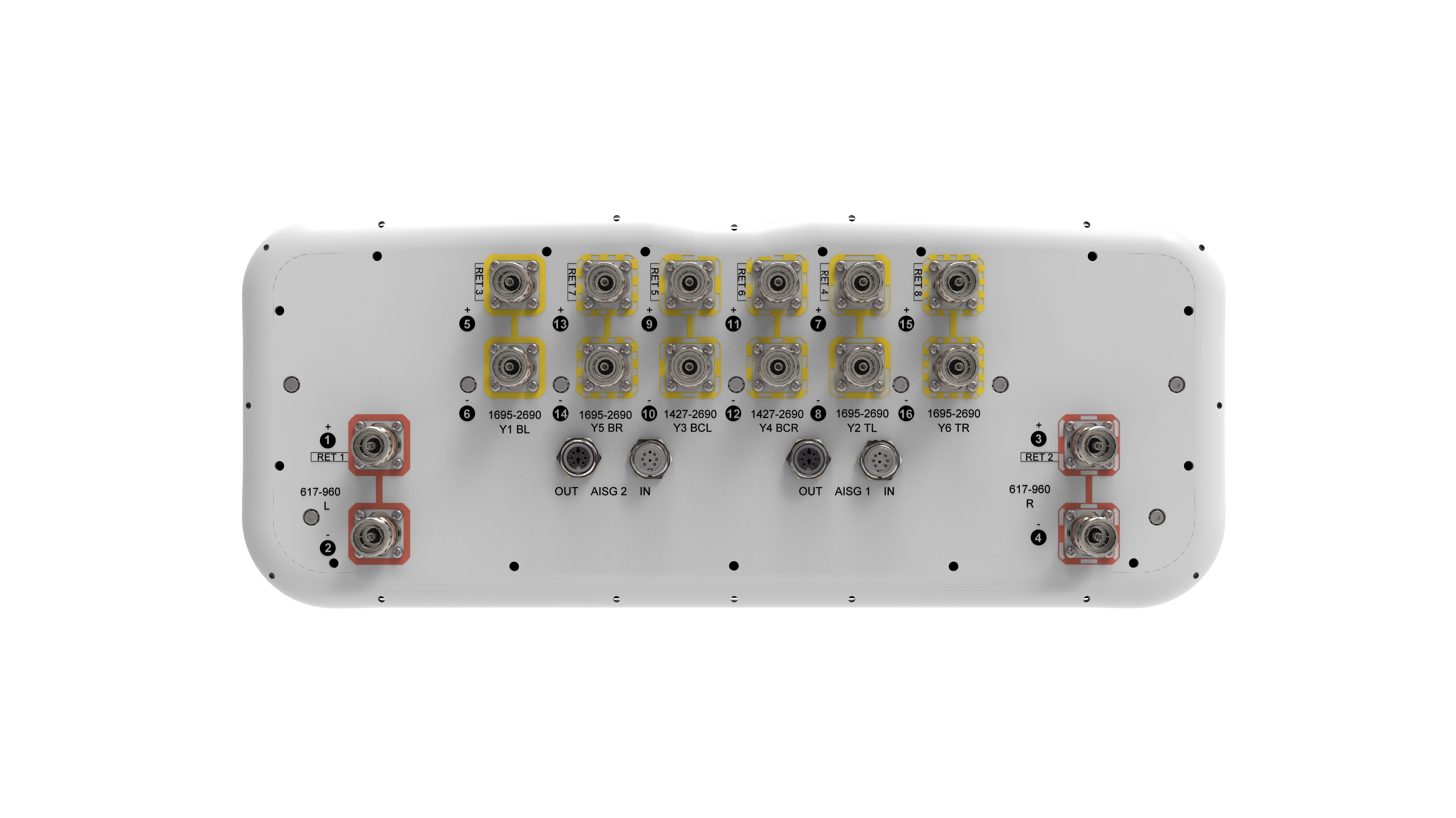 16-port sector antenna, 4x 617–960(R1, R2), 4x 1427-2690(Y3, Y4) and 8x 1695–2690(Y1, Y2, Y5, Y6) MHz, 65° HPBW, 8x RET. All Internal RET actuators are connected in “Cascaded SRET” configuration.