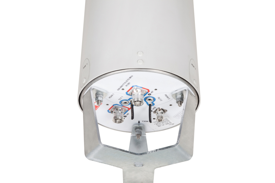2-port small cell antenna, 2x (698-896 and 1710–2180 MHz), 180° HPBW with fixed tilt in the low band and manual tilt in the high band. Contains internal diplexer and active GPS L1 band antenna