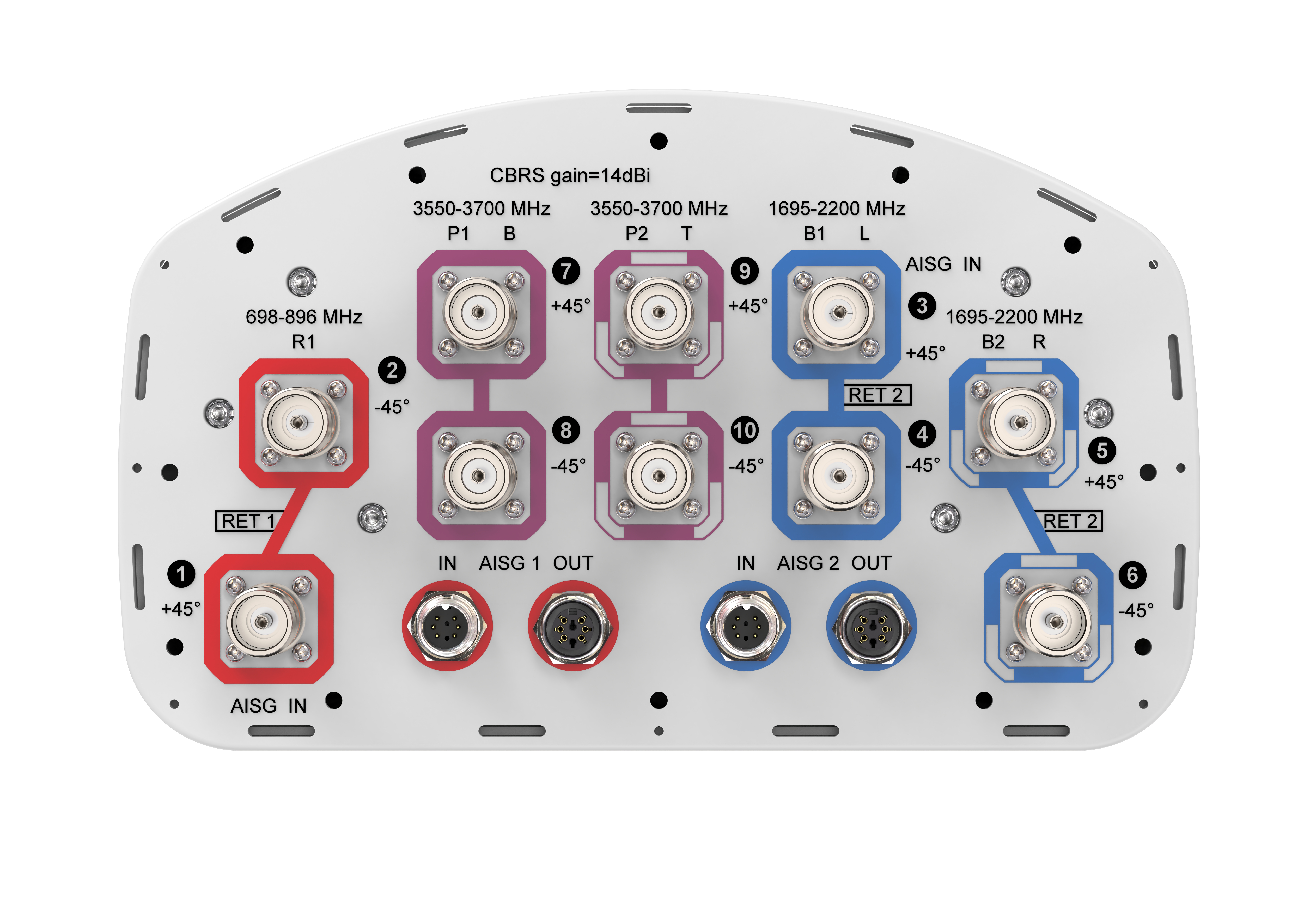 10-port sector antenna, 2x 698–896, 4x 1695–2200 and 4x 3550-3700 MHz, 65° HPBW, 2x RETs and 2x SBTs