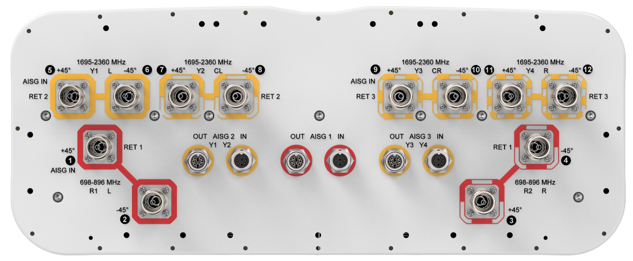 12-port sector antenna, 4x 698-896 and 8x 1695–2360 MHz, 65° HPBW, 3x RET, 3x SBT.