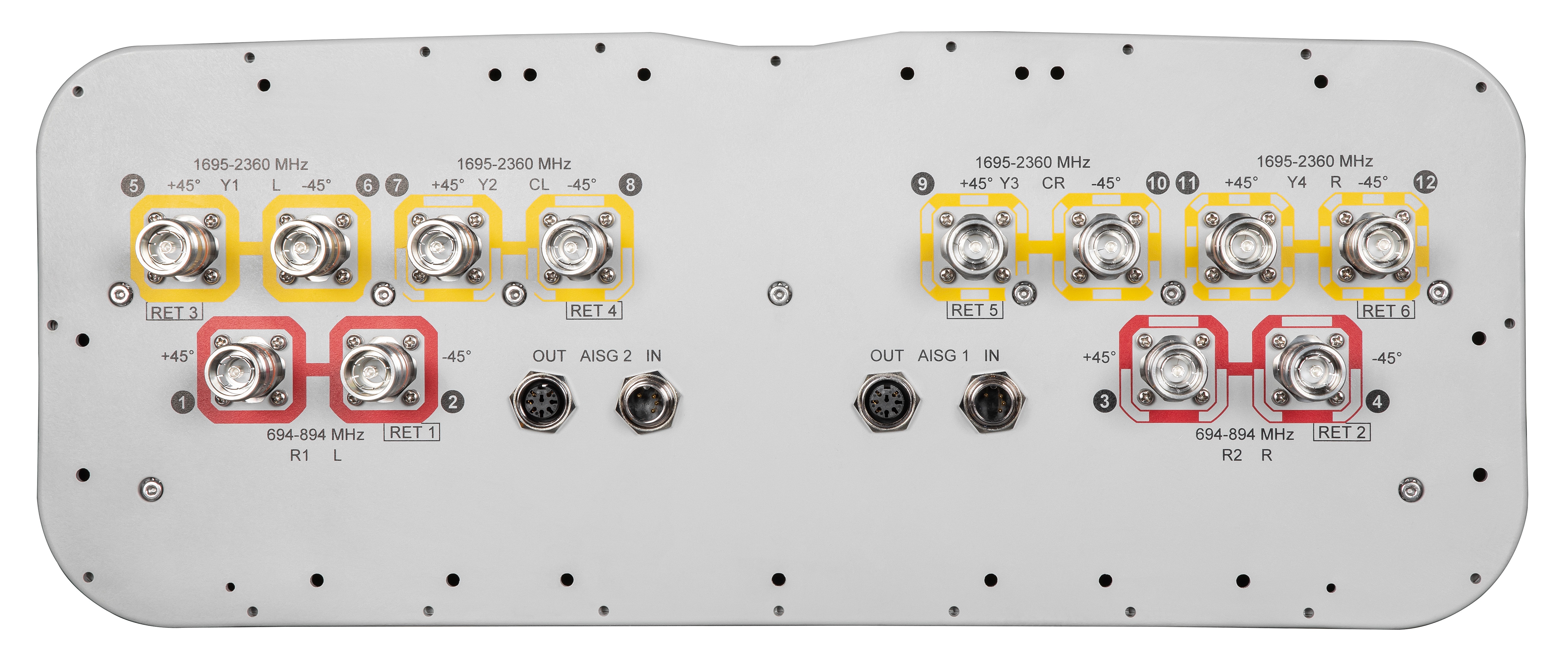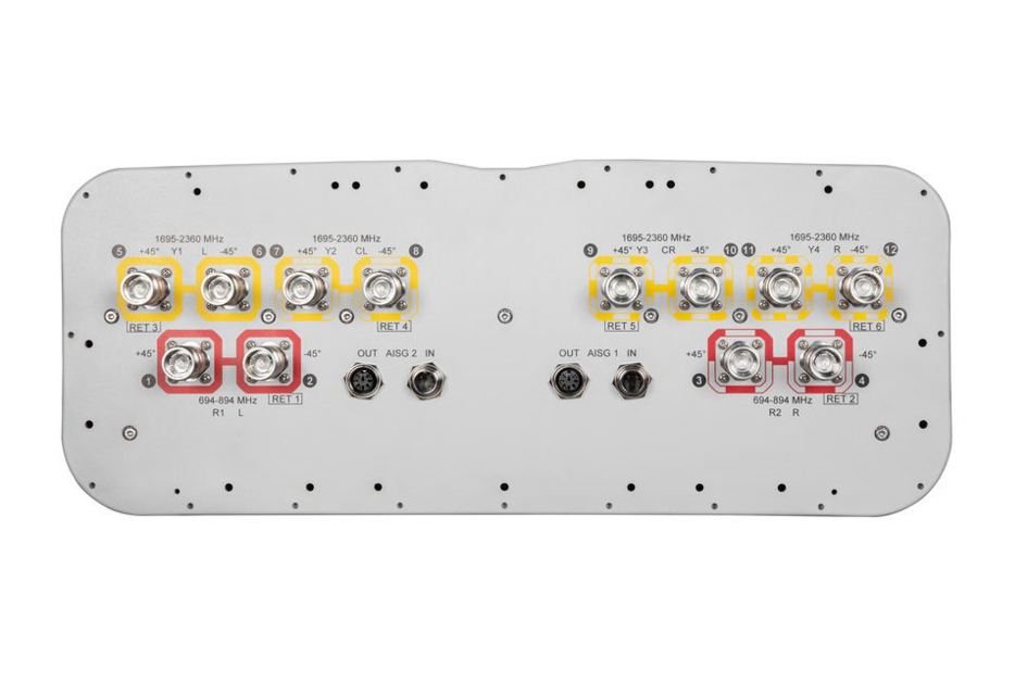12-port sector antenna, 4x 694–894 and 8x 1695–2360 MHz, 85° HPBW, 6x RETs
