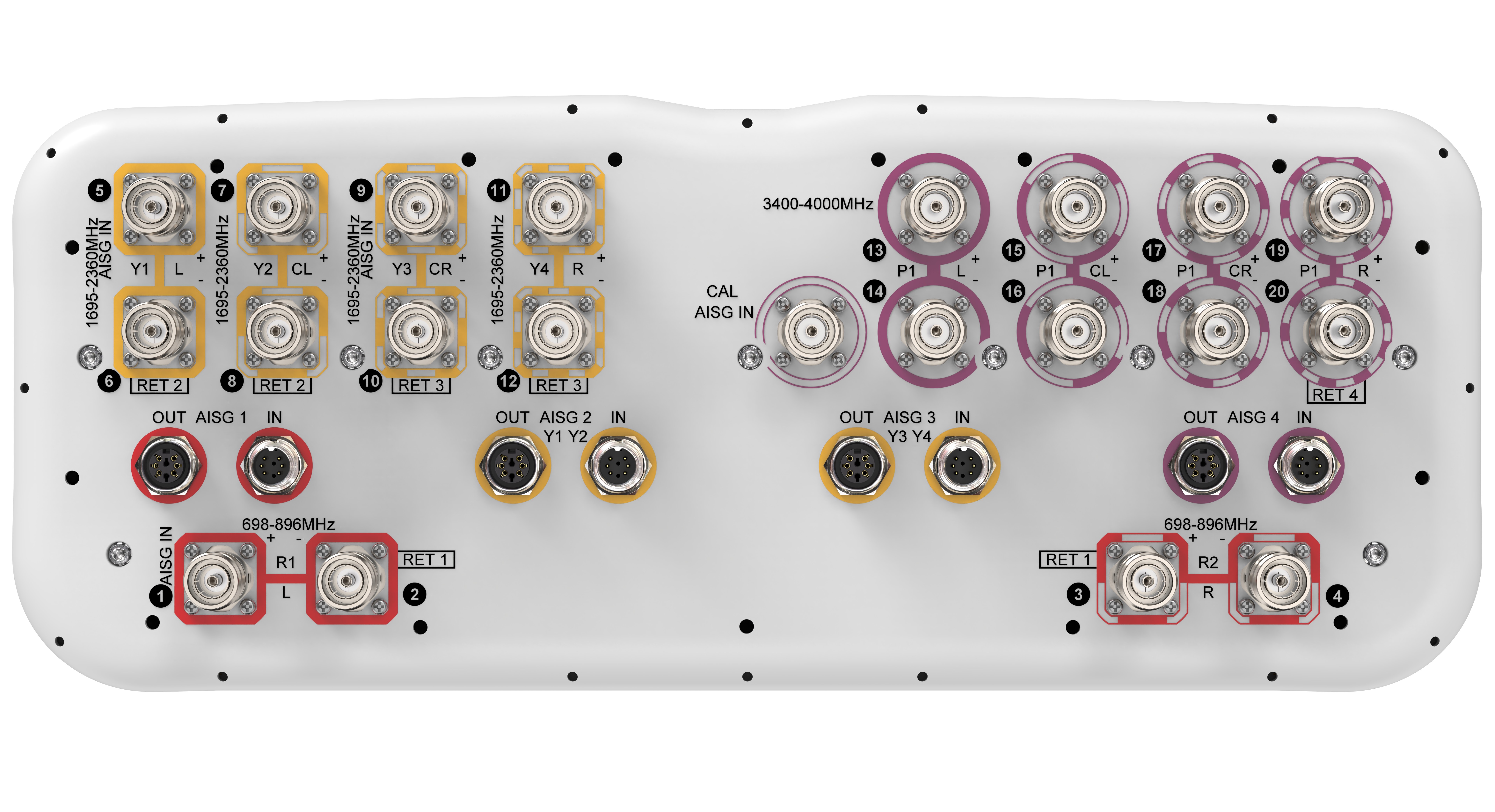 20-port sector antenna, 4x 698-896 and 8x 1695-2360 MHz, 65° HPBW, and 8 x 3400-4000 MHz, 90° HPBW, 4 x RET
