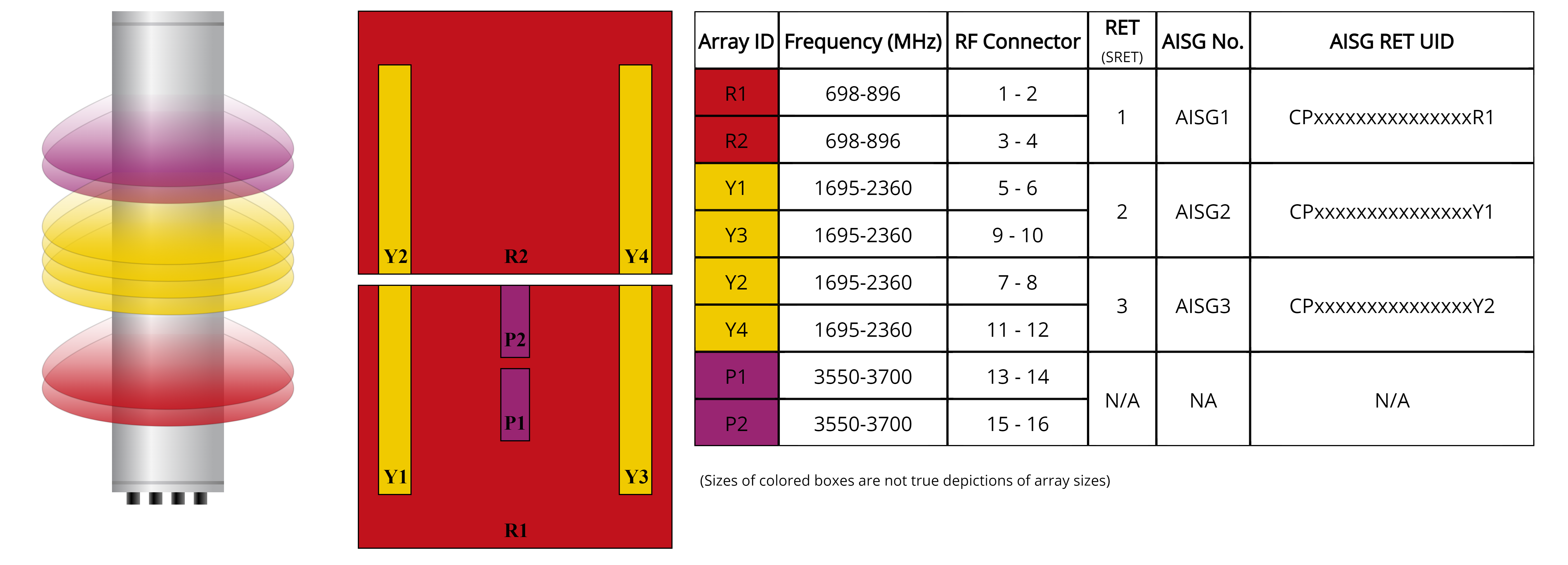- Array configuration provides capability for 4T4R (4X MIMO) on Low Band, dual 4T4R (4X MIMO) on Mid Band and 4T4R (4X MIMO) on High Band