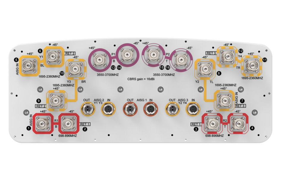 16-port sector antenna, 4x 698–896, 8x 1695–2360 and 4x 3550- 3700 MHz, 45° HPBW, 3x RETs and 3x SBTs.