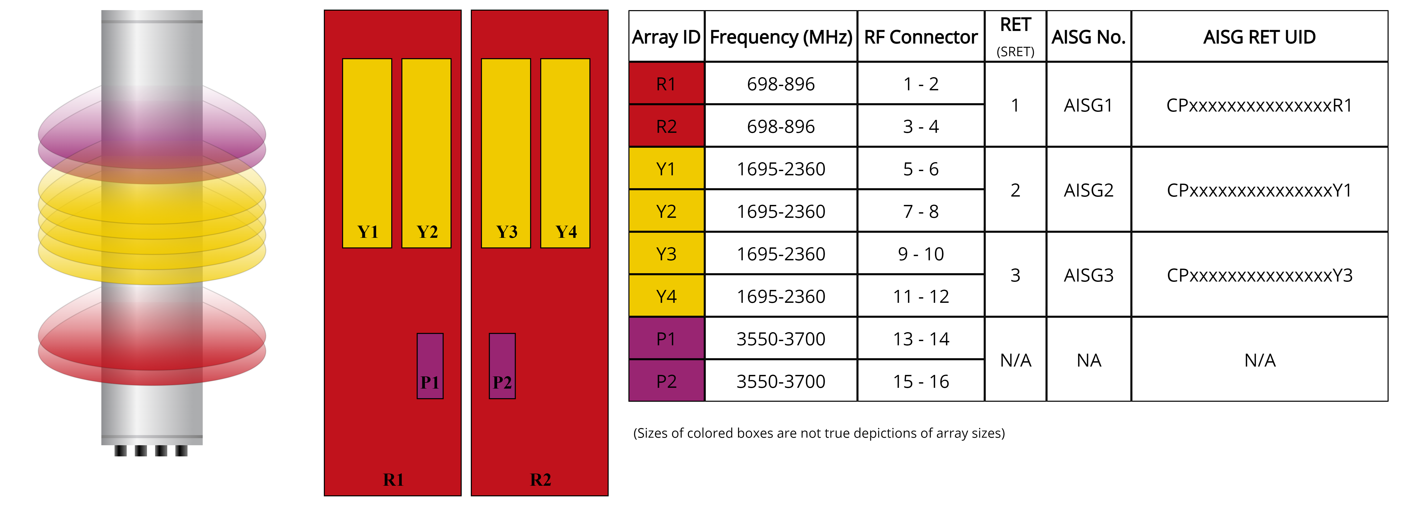 - Array configuration provides capability for 4T4R (4X MIMO) on Low Band, dual 4T4R (4X MIMO) on Mid Band and 4T4R (4X MIMO) on High Band) (inactive)