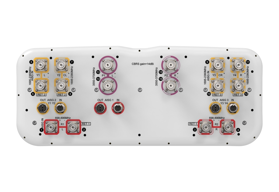 - Features broadband Low Band (698-896 MHz), Mid Band(1695-2360 MHz) and High Band (3550-3700 MHz) arrays for 4T4R (4X MIMO) capability for bands 5, 13, 25, 66 and 48. Also covers bands 12, 14, 29, and 30