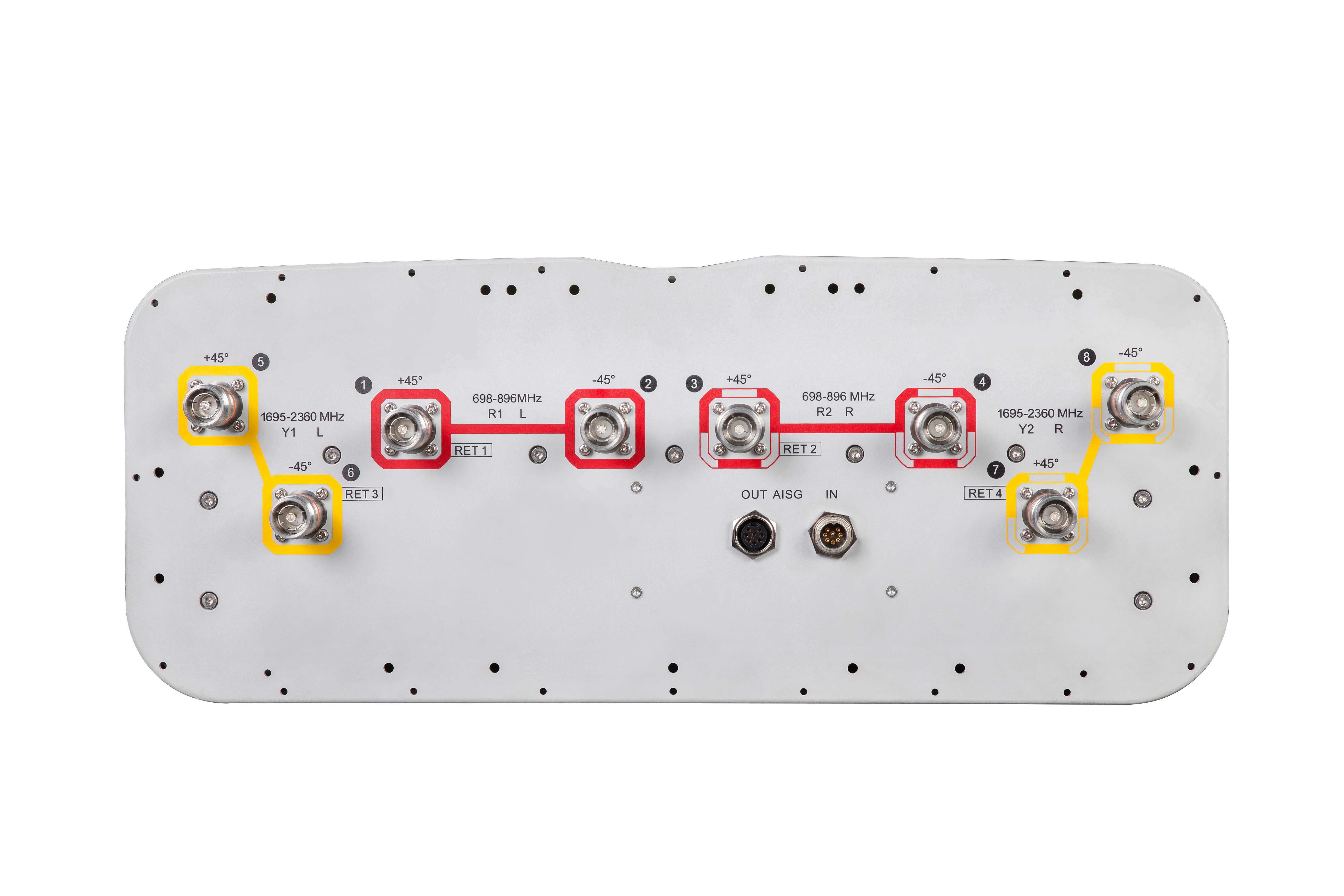 8-port sector antenna, 4x 698–896 and 4x 1695–2360 MHz, 65° HPBW, 4x RETs