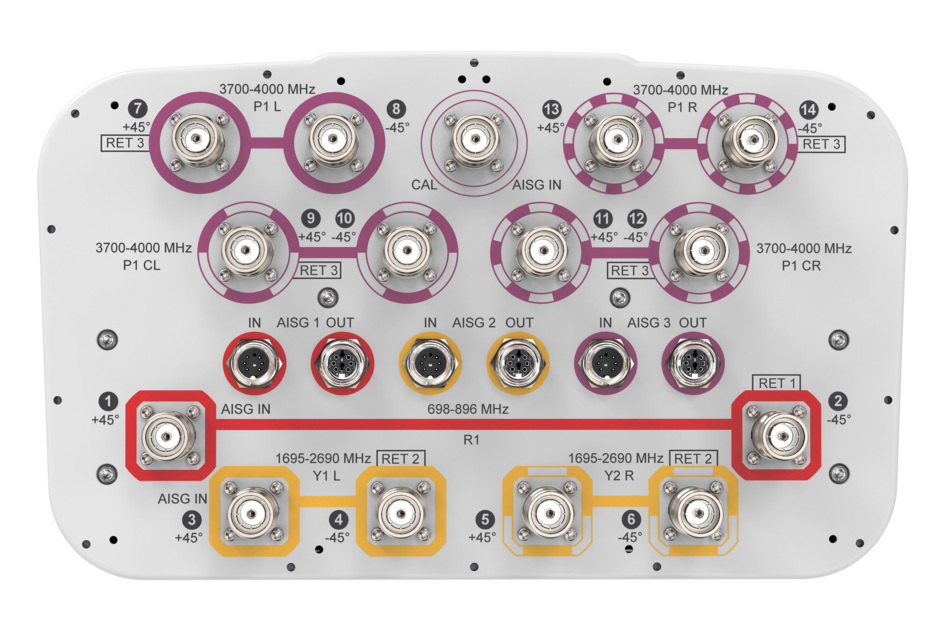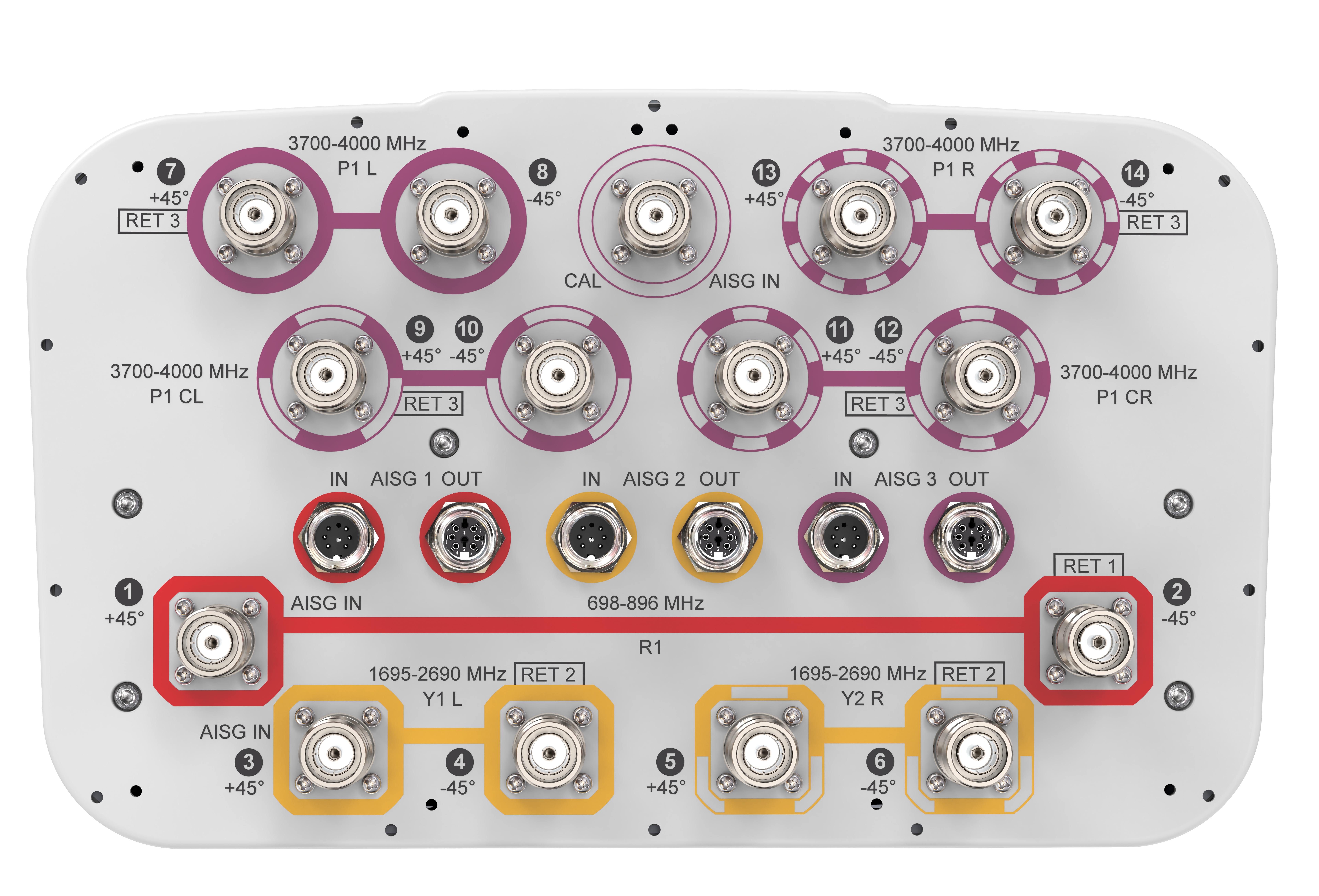 - One Low Band RET, One Mid Band RET and One High Band RET. Each RET controlled individually through internal SBTs