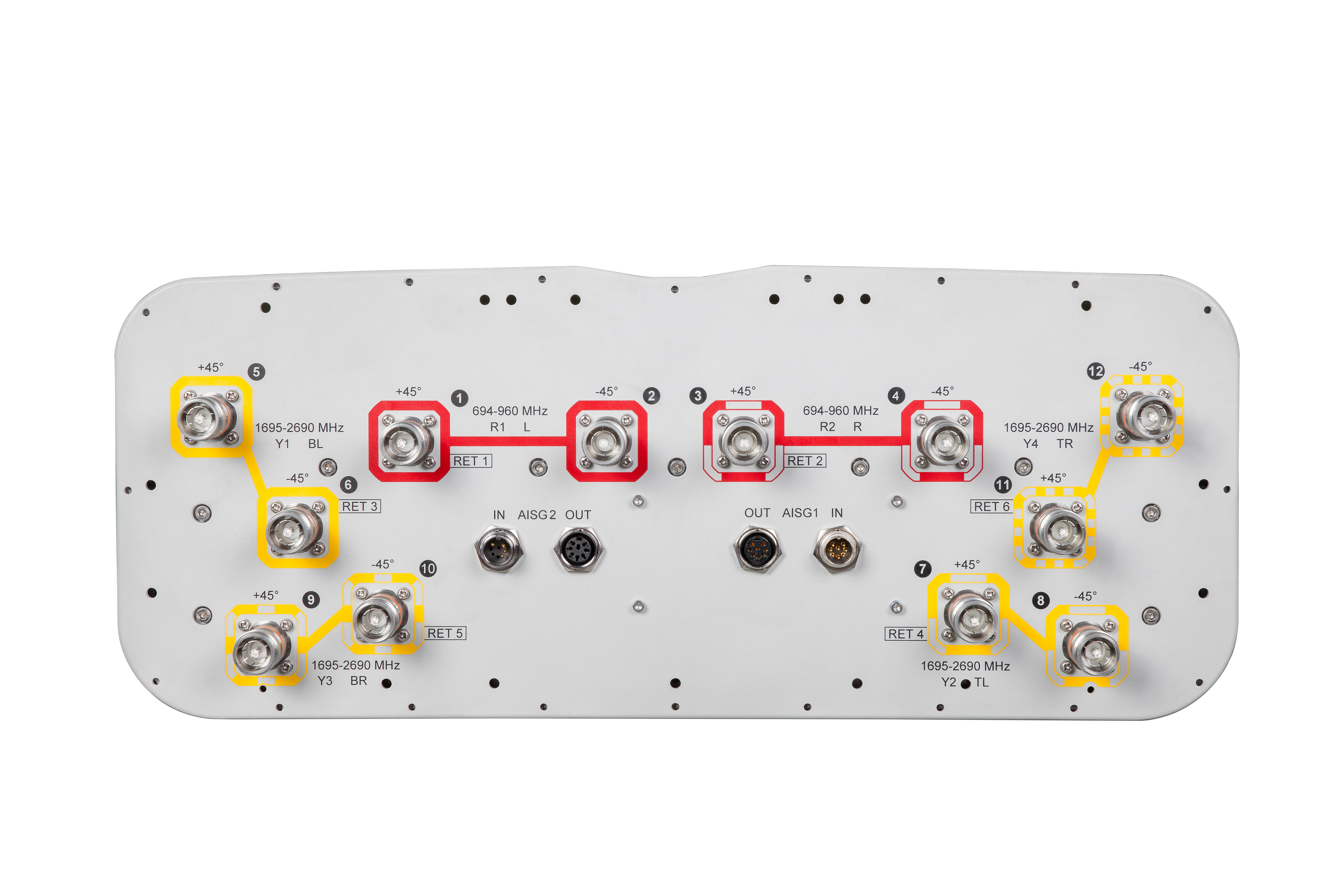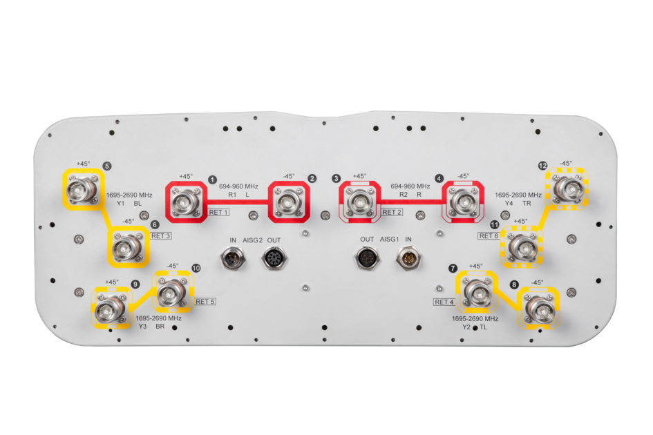 12-port sector antenna, 4x 694–960 and 8x 1695–2690 MHz, 65° HPBW, 6x RET. Antenna rear wind loading 880N @ 150km/h