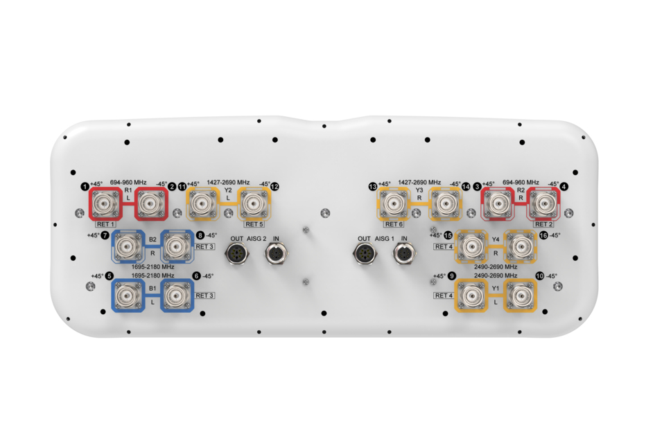 16-port sector antenna, 4x 694–960, 4x 1427–2690, 4x 1695-2180 and 4x 2490-2690 MHz, 65° HPBW, 6x RET