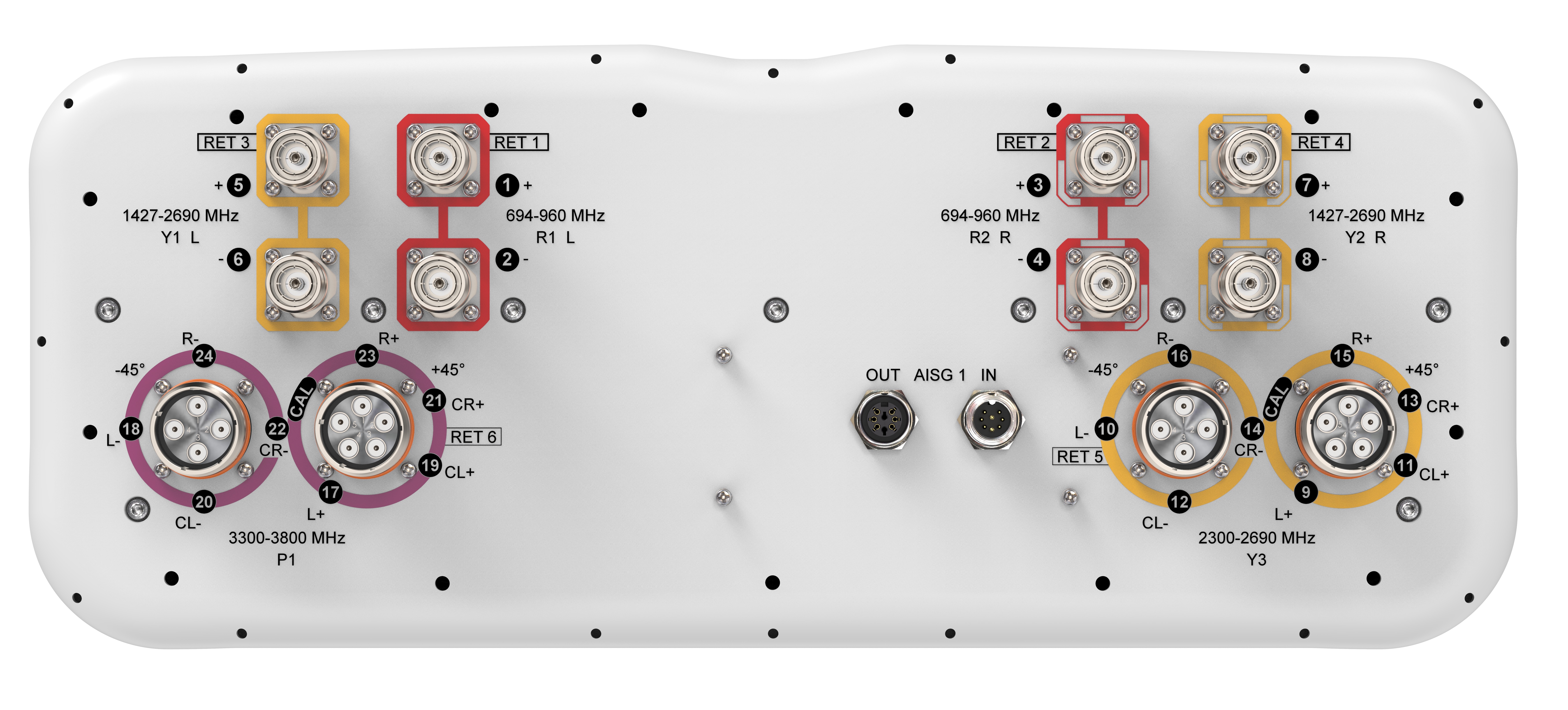 24-port sector antenna, 4x 694–960 and 4x 1427-2690 MHz 65° HPBW, 8x 2300–2690 and 8x 3300-3800MHz, 90° HPBW, 6x RET with MQ4 /MQ5 cluster connectors.