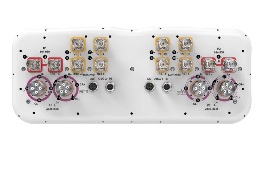 28-port sector antenna,4 x 694-960 MHz (R1,R2), 4 x 1695-2690 MHz (Y1,Y4) and 4 x 1427-2690 MHz (Y2,Y3) , 65° HPBW, 16 x 2300-3800 MHz (P1,P2), 90° HPBW, 8 x RET