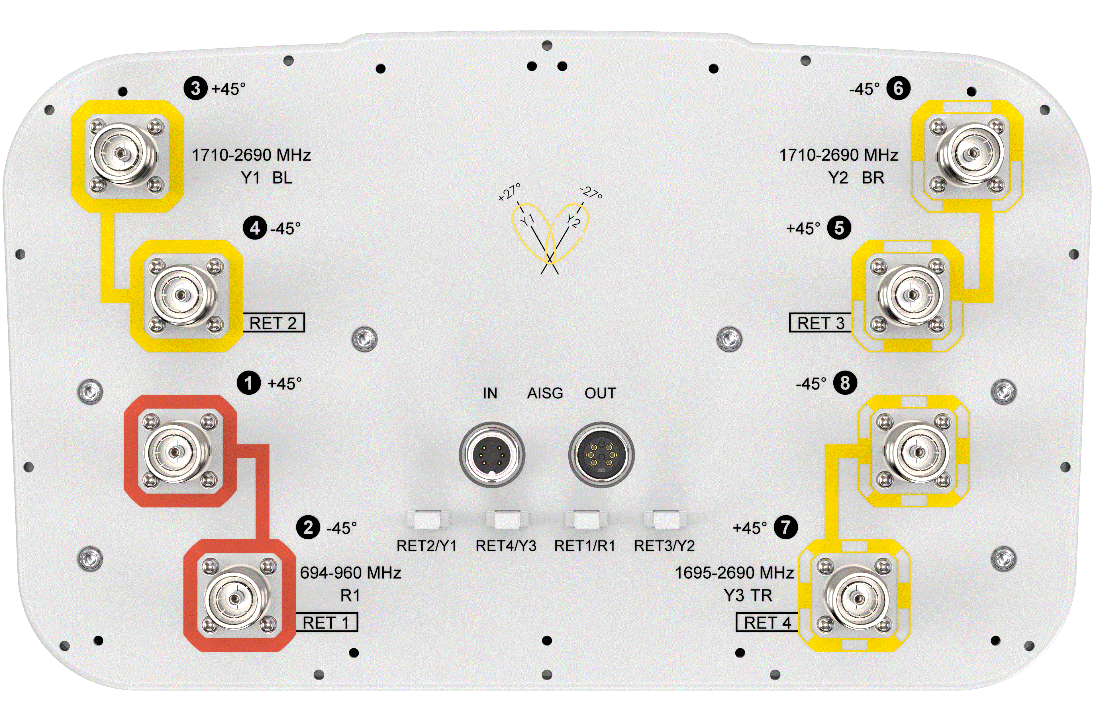 8-port sector/multibeam antenna, 2x 694–960 MHz 65° HPBW,2x1695-2690MHZ 65° and 4x 1710–2690 MHz 4x 33°HPBW, 4x RET with tilt indicators
