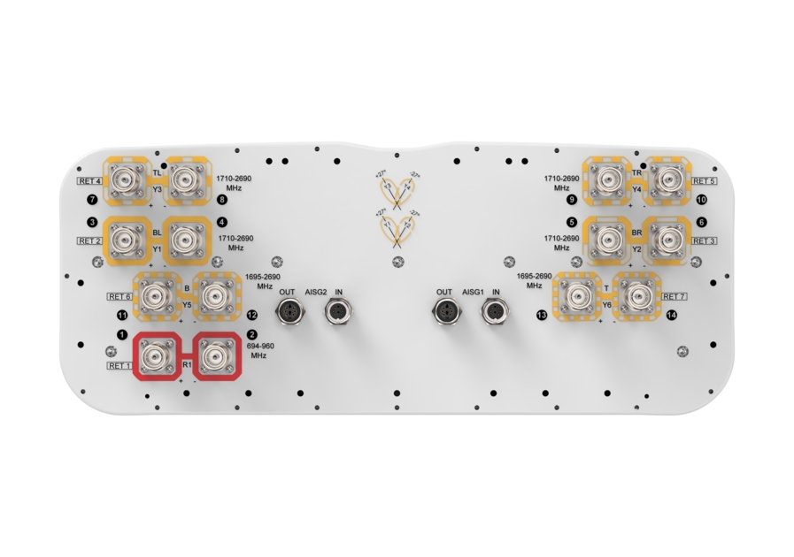 14-port sector antenna, 2x 694–960 and 4x 1695-2690 MHz 65° HPBW and 8x 1710-2690 MHz 4x 33° HPBW, 7x RET.