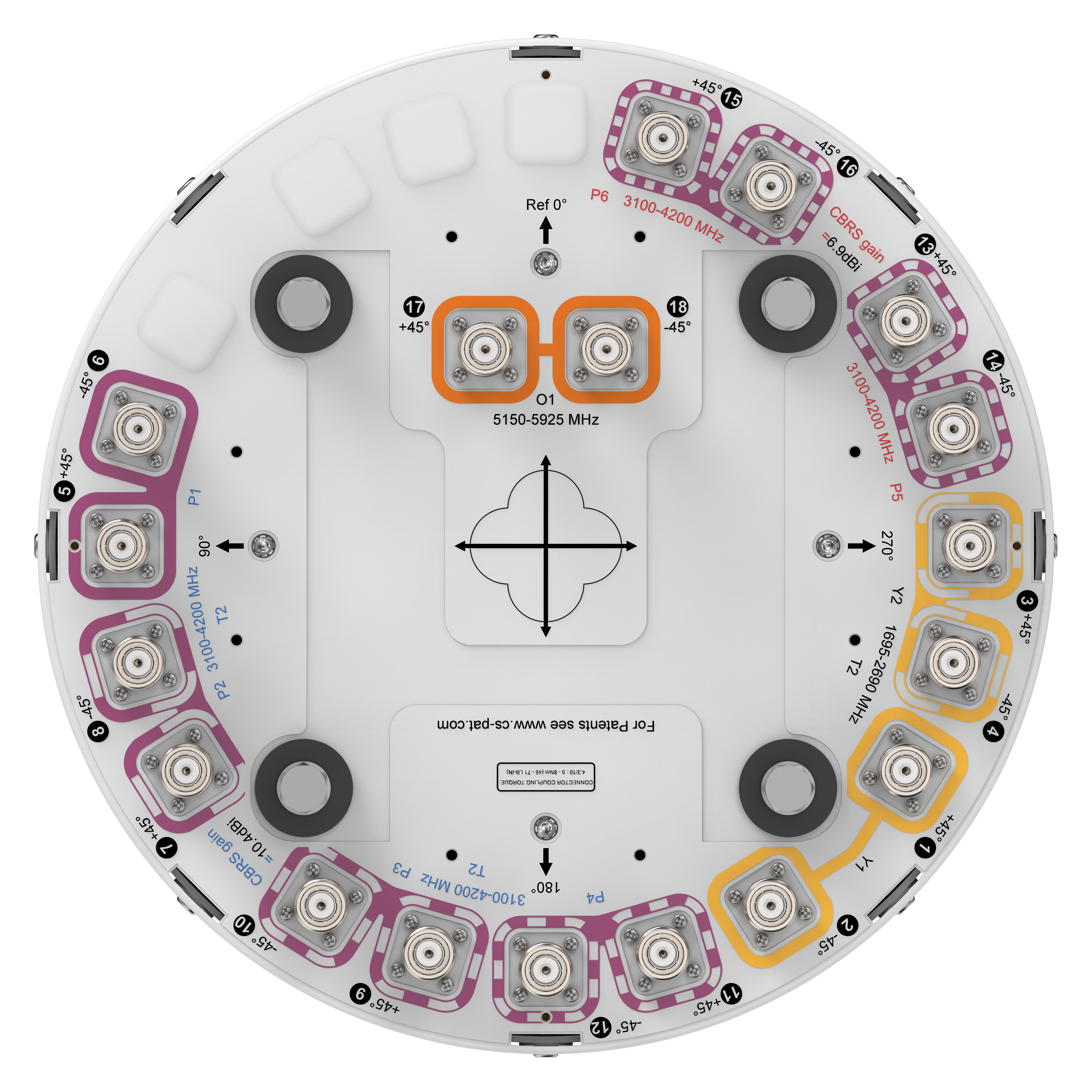 18-port small cell antenna, 4x 1695-2690, 8x 3100-4200,4x 3100-4200, 2x 5150-5925 MHz, 360° Horizontal Beamwidth, fixed tilt.