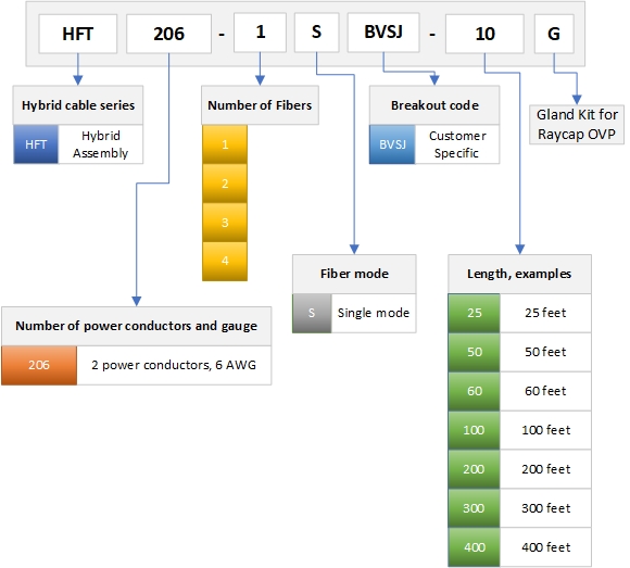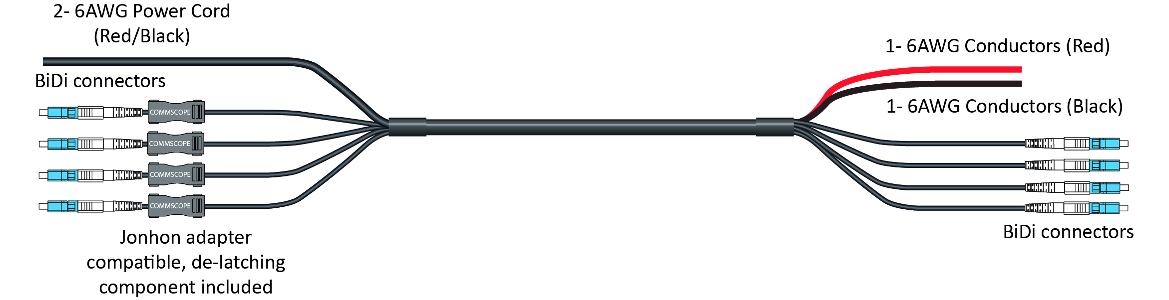 HELIAX® Hybrid Cable Assembly, 6-OVP box to RRU, Power Cord to RRU UR Type TC-ER, 2 Power conductors 6 AWG RRU, 6 AWG OVP, 4 fiber Bi-Di Jonhon adapter compatible pvc jacket aluminum armor, OVP gland insert kit included