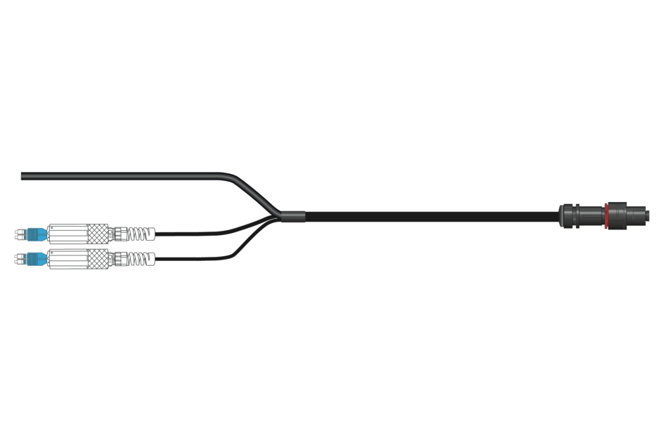 HELIAX® Hybrid Cable Assembly. HQLC End 1: 4 fibers DLC for Nokia AirScale RRUs, R2CT with power connector pre-installed (red / black conductors). End 2: 4 fibers terminated LC and 2 X 6 AWG conductors terminated at hybrid trunk connector