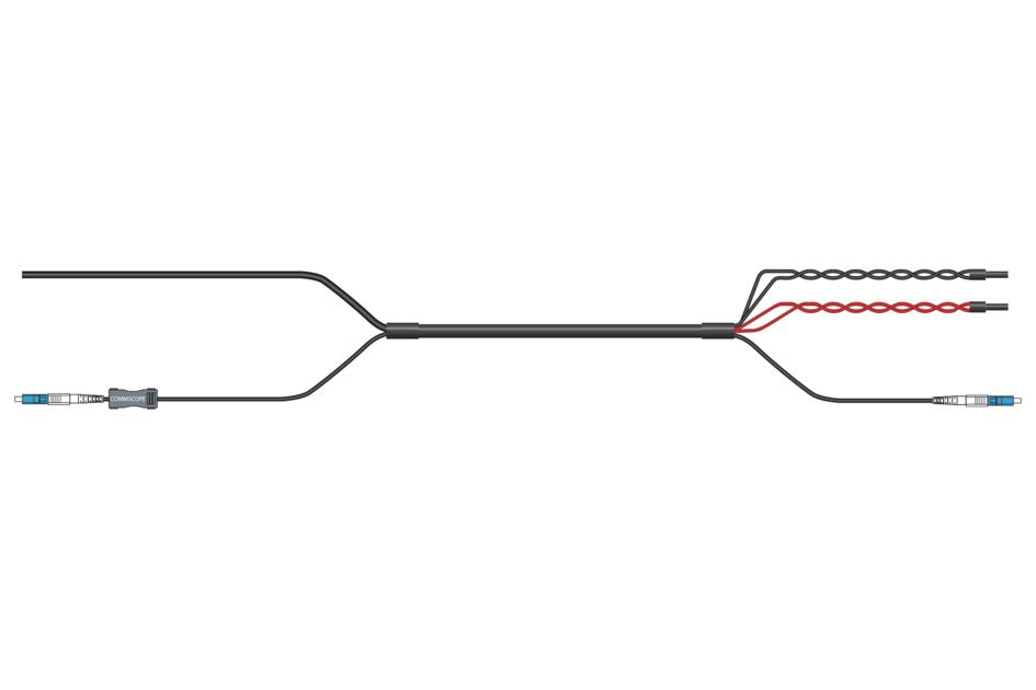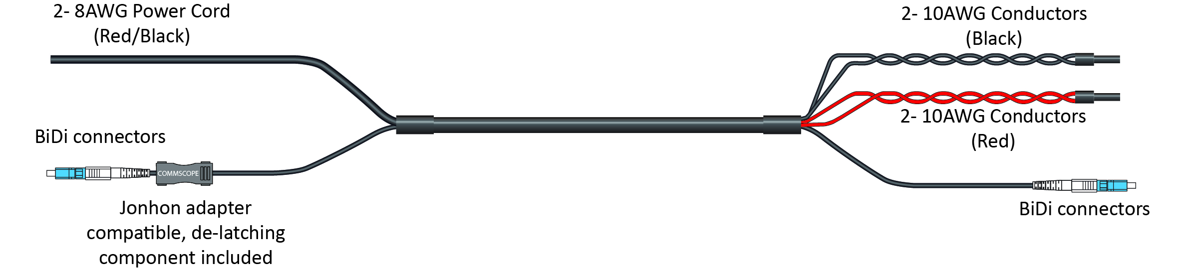 HELIAX® Hybrid Cable Assembly, 6-OVP box to RRU, Power Cord to RRU, UL Type TC-ER, 4 power conductors 8 AWG RRU, 10 AWG BBU, 1-fiber, Bi-Di, Jonhon Adapter Compatible, PVC jacket, aluminum armor, OVP gland insert kit included
