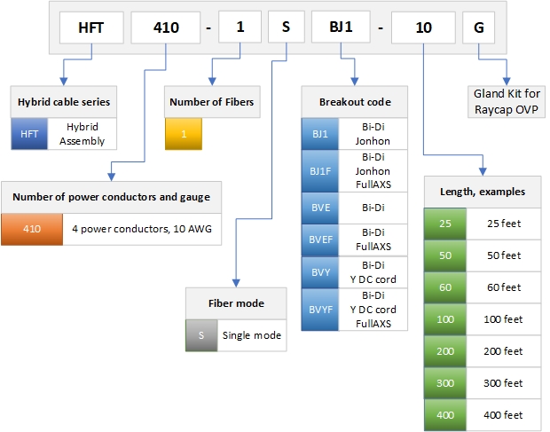 HELIAX® Hybrid Cable Assembly, BiDi, 6-OVP box to RRU, UL Type TC-ER, 4 power conductors 10 AWG at OVP, 1 power cord 8 AWG at RRU, 1 Simplex fiber connectors, FullAXS, PVC jacket, aluminum armor, weather shroud installed, OVP gland insert kit included