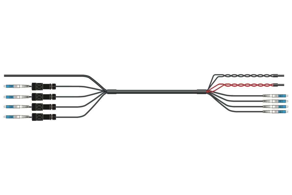 HELIAX® Hybrid Cable Assembly, BiDi, 6-OVP box to RRU, UL Type TC-ER, 4 power conductors 10 AWG at OVP, 1 power cord 8 AWG at RRU, 4 Simplex fiber connectors, FullAXS, PVC jacket, aluminum armor, weather shroud installed, OVP gland insert kit included
