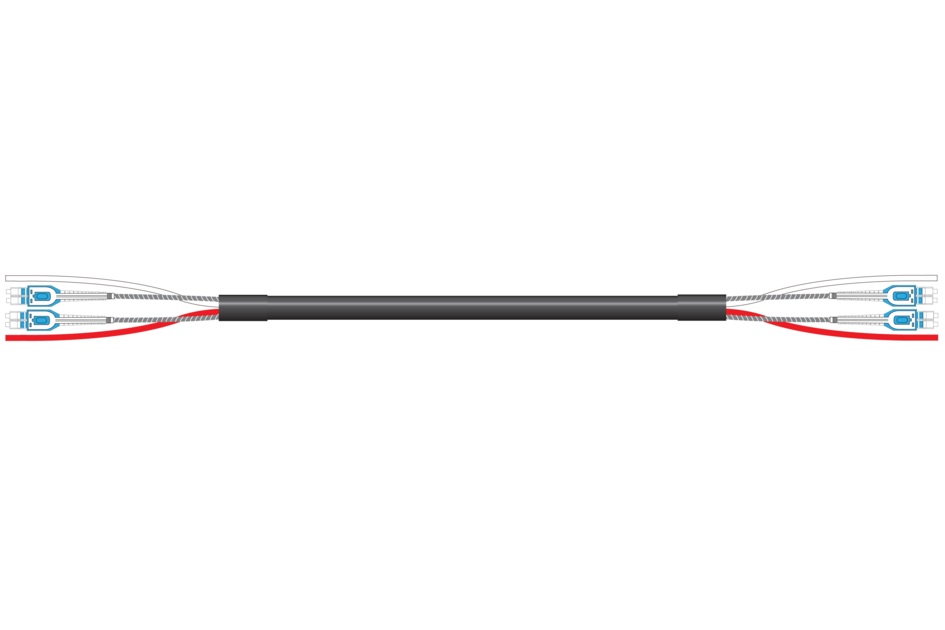 HELIAX® Hybrid Jumper Singlemode B2ca Red/White 2 cores 1.5 mm2 Blunt Cut/Blunt Cut 4 fibers DLC to DLC Breakout length DC/FIBER 170mm No weatherproofing shroud.