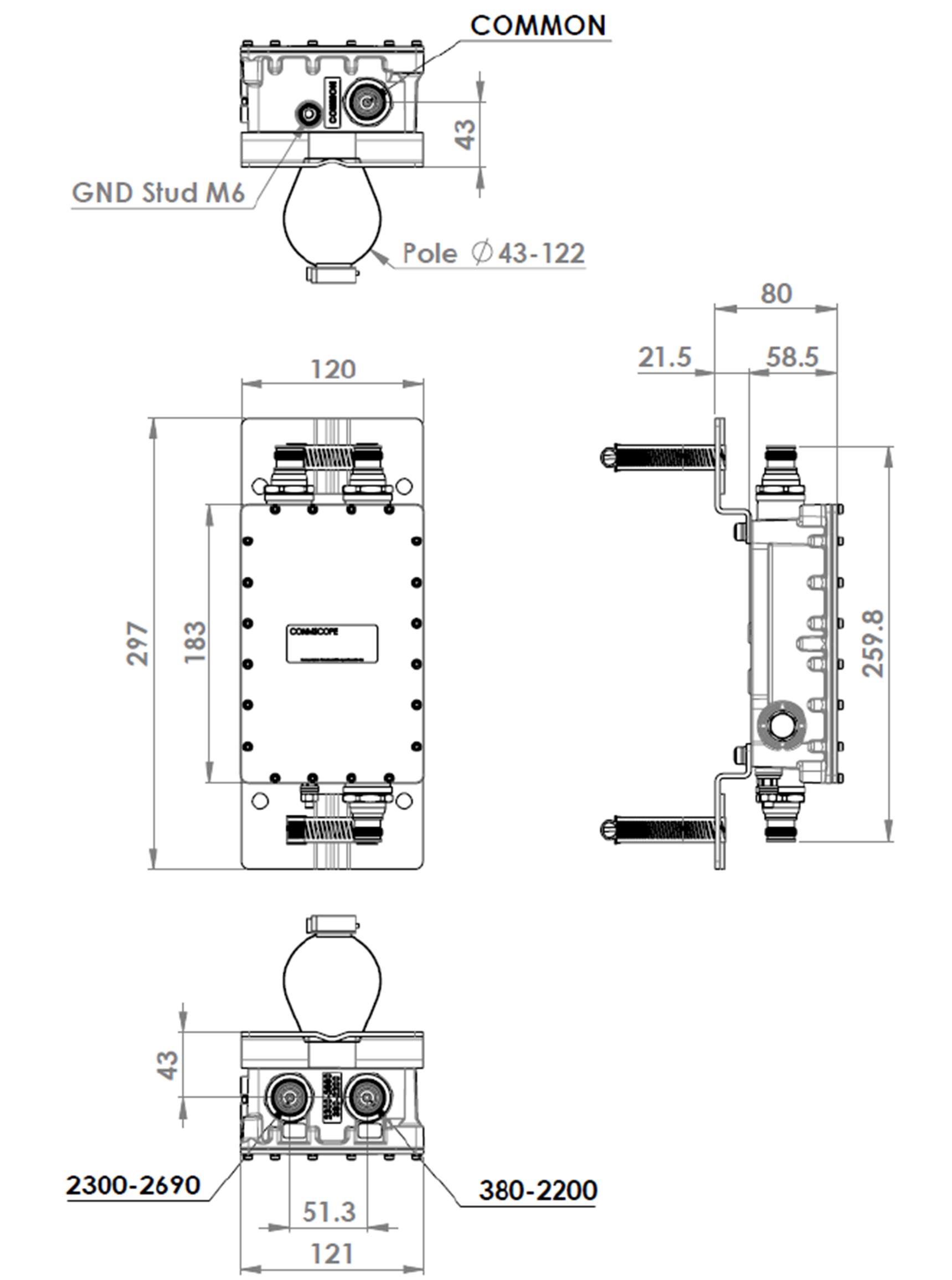 Diplexer, 380–2200 MHz/2300–2690 MHz, DCauto, with 4.3-10 connectors