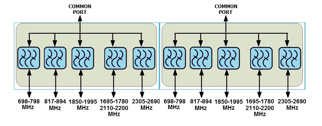 Compact Twin Pentaplexer, 700/850/PCS/AWS/WCS-BRS, 4.3-10