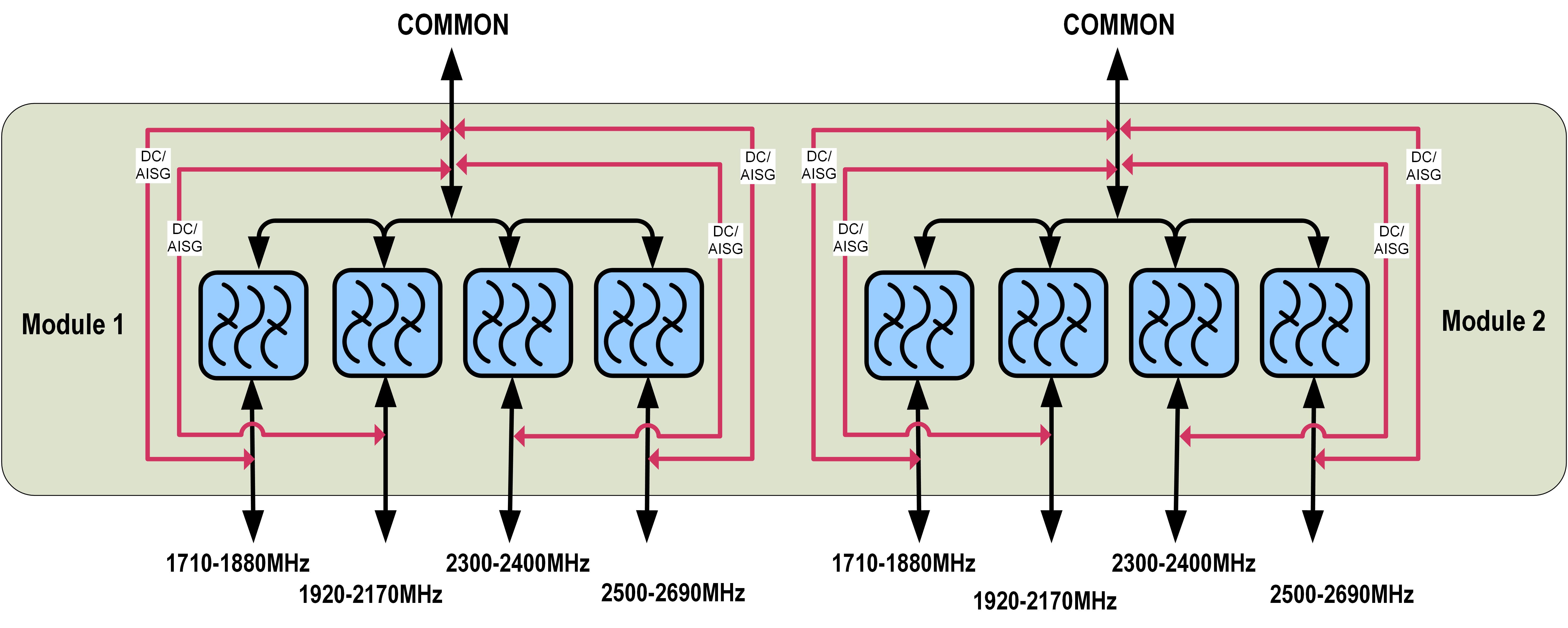 Twin Quadplexer 1800//2100//2300//2600 MHz, All ports DC bypass, with 4.3-10 connectors
