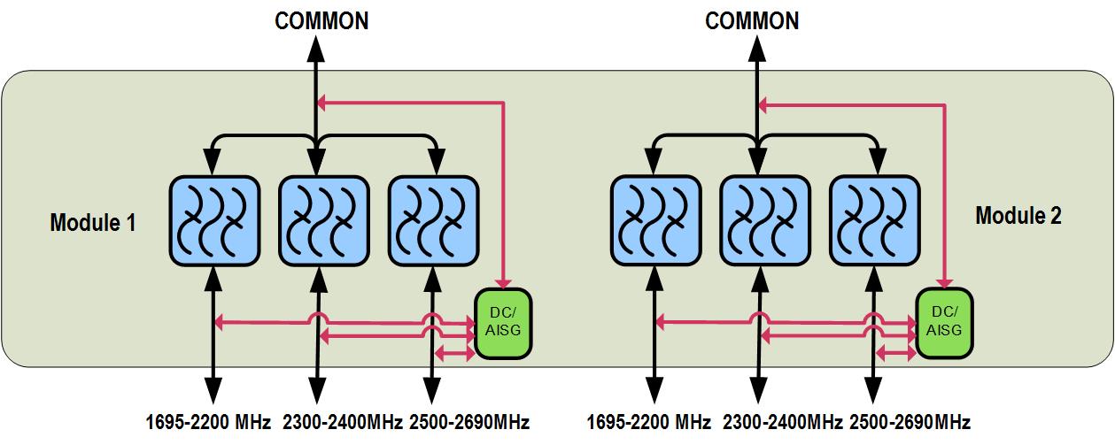 | dc/AISG Pass-through Path | Auto sensing circuitry detects dc/AISG signal presence and selects path |