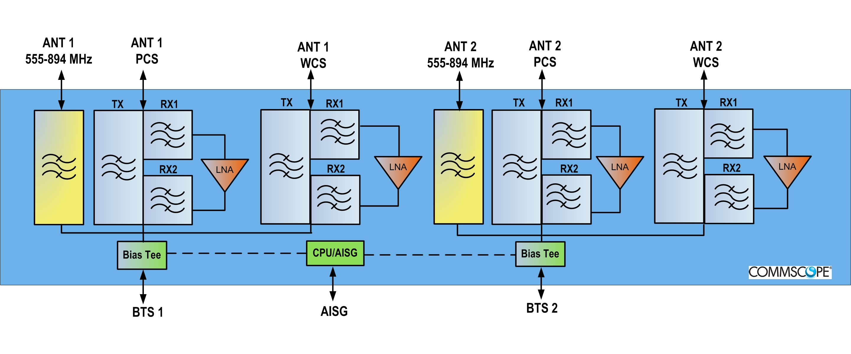 Twin TMA PCS/WCS with 555-894 MHz bypass,4.3-10 connectors